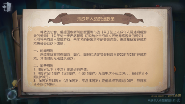 1.时间限制:未成年玩家可以在每周五、六、日和法定假日的晚上八点到九点登录游戏,其他任何时间都不可以使用。