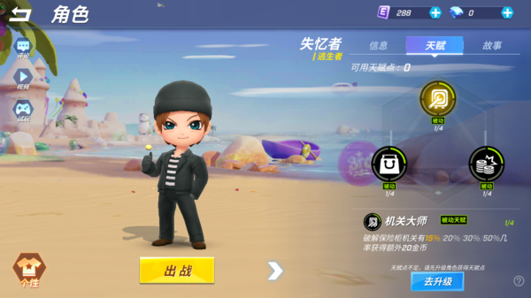 失忆者洛杰,是玩家能获得的逃生者阵营初始角色,有三个被动的天赋技能。机关大师:破解保险机关有一定的几率获得20金币;购物大师:购买道具后,有一定的几率触发下次购买免费技能;来抓我呀:在游戏中击中追捕者后,有一定的几率获得30金币。同时这些天赋是能升级的,随着天赋等级的提升,获奖几率也会提高。