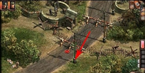 选择另一个士兵(点击屏幕左上角的士兵头像),移动到如下图箭头所指的电线杆这里,然后爬上去。