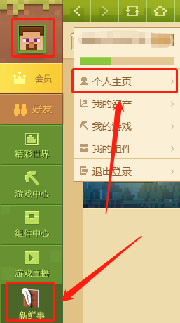 步骤一:在电脑上打开我的世界,并登录一个自己的账号。进入游戏之后,点击游戏界面左上方的玩家头像,在弹出的选项框中,点击“个人主页”。也可以直接点击游戏界面左侧的“新鲜事”图标,来打开个人页面。