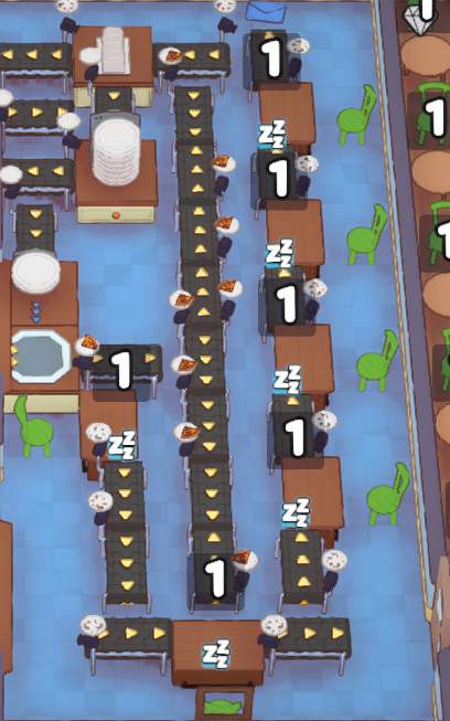 这种流水线收盘子,可能是游戏机制,在桌上的盘子被传走,上一个盘子还没到桌子上的时候,游戏判定这是桌子上没脏盘,顾客就会坐下。