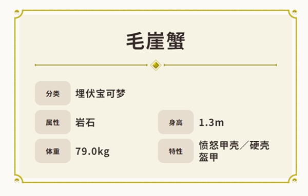 毛崖蟹拥有的特性“愤怒甲壳”,是本作登场的新特性。毛崖蟹的HP降到一半时,会因愤怒而降低防御和特防,而攻击、特攻与速度则会提升。