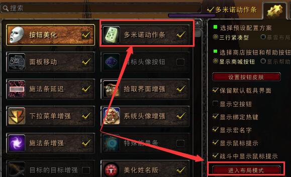 1、打开有爱插件,进入“界面设置”。找到“多米诺动作条”。