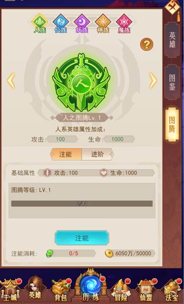 图腾共有5种系别,开启后可使用金币和相对应的图腾遗物提升图腾等级和属性,图腾每10级可进阶1次,进阶后额外提升图腾百分比属性。