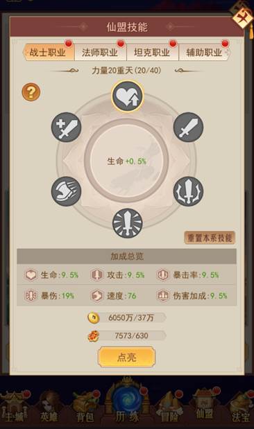 仙盟技能系统内可以提升4个英雄职业的基础属性加成,只需用金币和仙盟贡献材料升级技能即可,即使退出了仙盟也会仙盟技能在新仙盟也会继续生效哦~