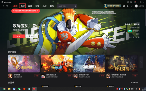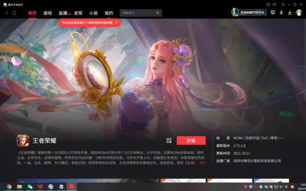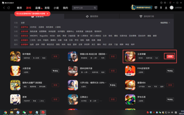 3、接着,在众多的游戏当中,找到自己想要玩的游戏,比如【王者荣耀】,然后点击其右侧的【安装】按钮。