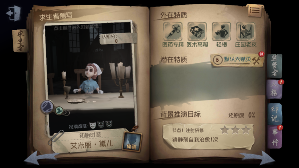 医生:作为玩家能获得的游戏初始角色之一,医生随身携带治疗工具,可以在受伤状态下治疗自己,也可以救援被抓或被攻击的队友。