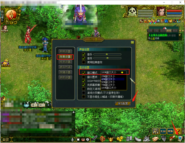 第四步,在效果设置页面切换窗口/全屏模式还有一项特别功能,便是可以对游戏窗口的大小进行设置,这样在玩家想要挂机的时候也可以切换至最小窗口放置在电脑桌面边缘而不会影响其他。