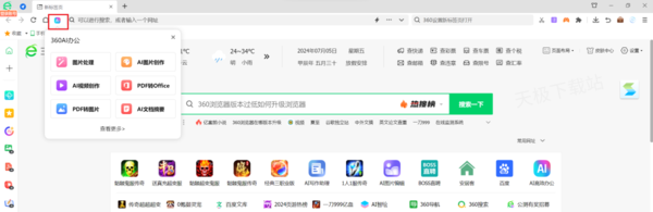1.下载并打开360浏览器,在浏览器页面左上方找到【AI】选项,点击【查看更多】。