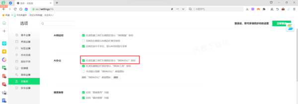 2.在设置页面的左边找到【实验室】,在页面中间【AI办公】将第一行选项勾选,这样就可以在首页找到【360AI办公】啦。(如果没有此选项,有可能是360浏览器的版本过低,更新版本后查看即可)