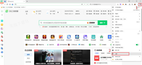 1.找不到AI办公可能是被隐藏了,我们打开360浏览器,依次点击右上角【三条横线】-【设置】。