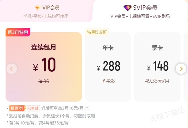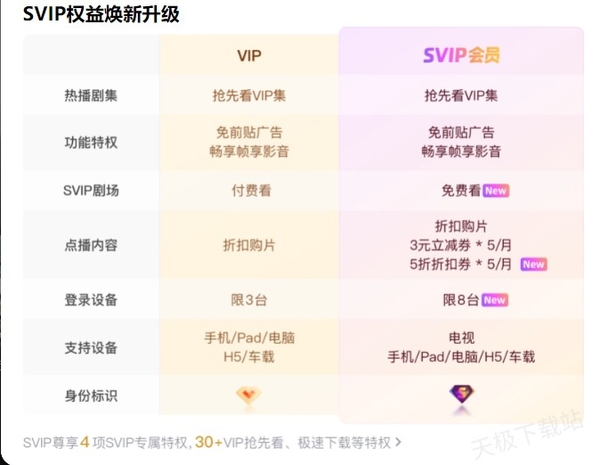 SVIP:设备限制更宽松,支持在多达8台设备上使用,包括电视、手机、Pad、电脑、H5(网页版)和车载设备等。