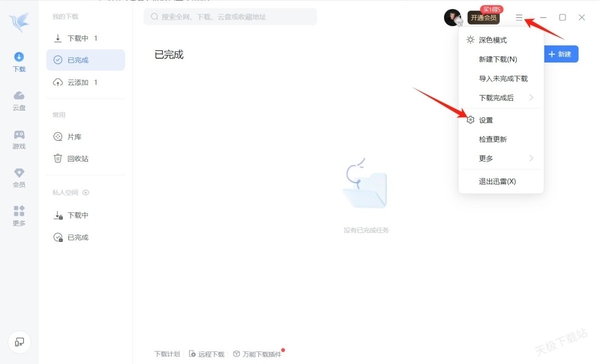 1.打开迅雷,然后点击迅雷主页面右上角三条横线的图标,并点击弹出菜单中的“设置”选项。