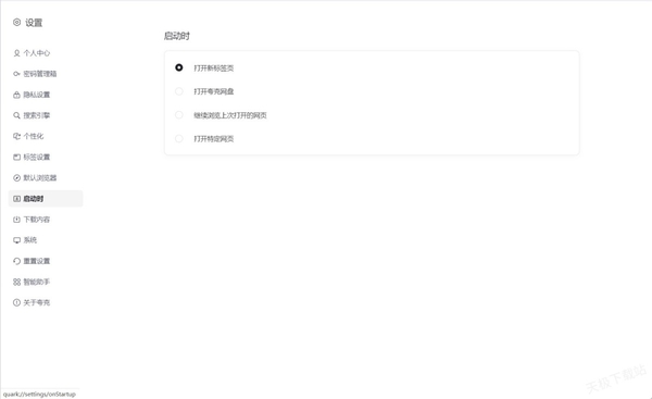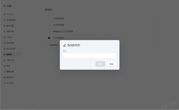 如果您想要将夸克导航设为夸克浏览器的首页,操作同样简单。在上述“启动时”功能页面,选择“打开特定网页”选项后,找到夸克导航的入口,然后输入网址,点击确认即可。