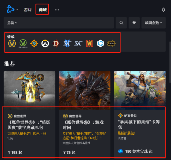 在暴雪战网客户端主页面,点击上方的商城字样,就能跳转到游戏商城中。用户可以根据不同的游戏,来查看商城中礼包、卡牌包或者是周边商品,不同的游戏商品购买需要的东西也不同,请注意区分。