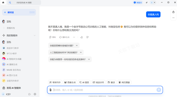 豆包AI聊天并不是和真人聊天,由于豆包的AI聊天功能非常好用,很多人误以为自己再跟豆包背后的真人聊天,这恰恰说明的豆包这款AI软件的优秀。豆包AI的回答,是通过读取用户问题的文案,配合网上的大数据算法进行推理得来,因此一些回答会比较贴合用户实际情况,另外,豆包的AI聊天功能其实非常多样,除了基础的豆包聊天,用户还可以自己创建虚拟动漫、游戏、影视剧角色进行AI聊天,数据量非常庞大,多少人都无法同时处理这些数据。