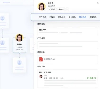 无论是在会议中还是文档里或是群聊中,用这套系统只要快速点击头像就能够查看员工的资料,方便管理人在办公场景中快速的挖掘各个部门人才,避免出现脸熟人不熟的尴尬情况。