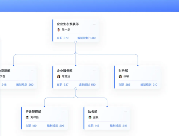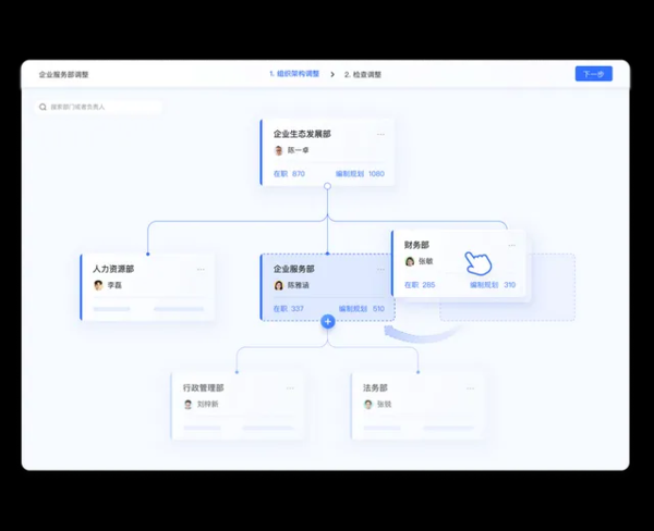 使用这套人事管理系统可以非常简洁的看到各个部门的组织架构以及人事变动,操作方法也非常简单,就是电脑桌面上的拖拉拽,就可以实现复杂的人员调整和部门重组,还能够自动匹配到对应的审批流程中,方便每一个组织的高效优化。