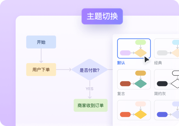 2,飞书画板可以预制配色主题并一键切换,有炫彩,复古,简约蓝,简约灰等各类主题配色,进一步增加轻松愉快的会议氛围,不需要繁琐的调试就能够展现出契合的美感。