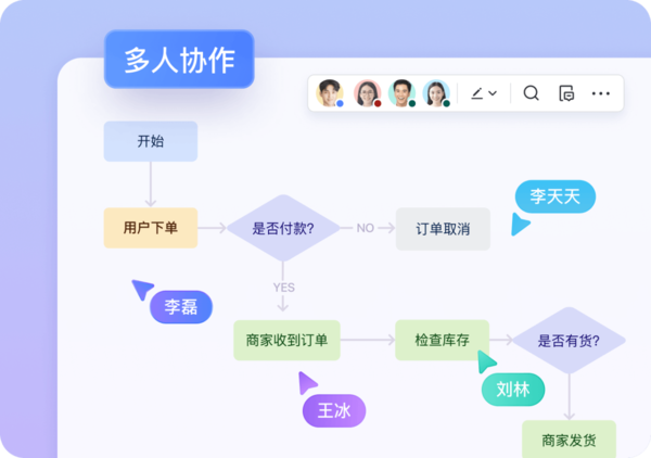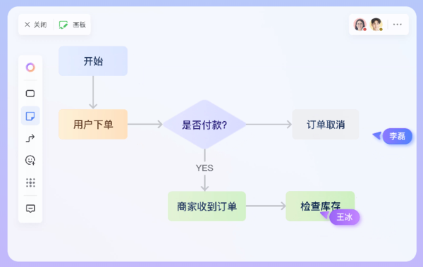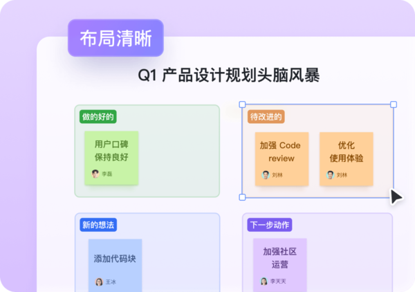 1,在同步协作时,画板上会有协作的光标,让每一个员工都有参与其中的感觉,而且使用画板工具可以直接艾特其他同事进行评论或者发表意见,对方会快速的同步收到相关信息。