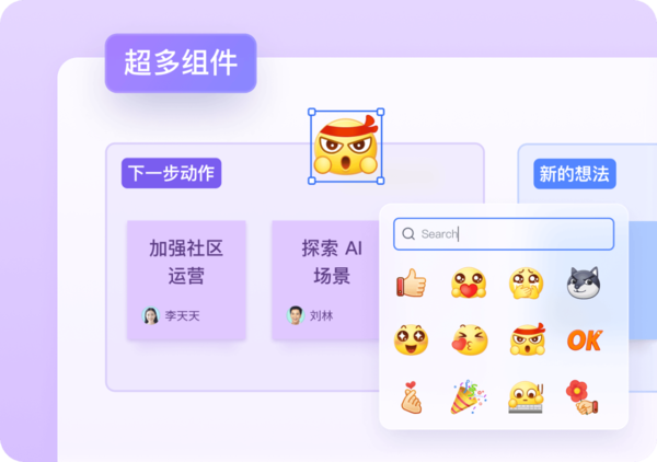 1,飞书画板支持众多画板组件,让使用者快速选择类型多样的图形和各种意义的图标,简单搜索就能够快速使用,还可以插入外部图片,拓展画板的表达内容。