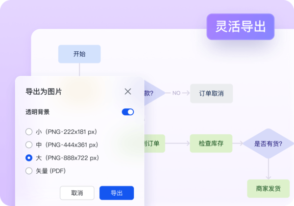 4,画板中展示的内容支持导出图片或PDF格式,大小可以自定义选择,所以在开会时在画板上呈现的全部或局部内容都可以直接复制到粘贴板。
