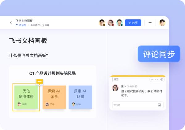 2,在飞书的其他功能中比如打开文档,也可以添加画板工具,画板上的评论和意见会同步到文档中,成员点击相应的评论就会直接定位到画板的原文上面,非常的实用。