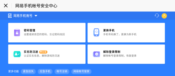 1.密码管理:还是在用户个人中心界面,点击下方选项中的账号管理键,就能跳转到网易手机账号安全中心界面。点击页面中密码管理键,跳转输入手机验证码后,就能设置、修改或找回账号密码了。