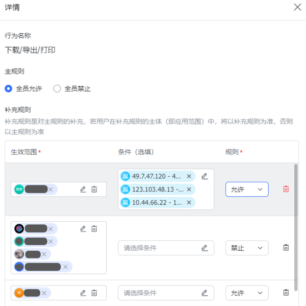 1,可以对不同部门的某一批人进行针对性的禁止或允许权限吗,我们要先创建一个用户组,把这批用户加到用户组中,然后再设置规则中把允许生效的对象选择到这个组里就可以了。