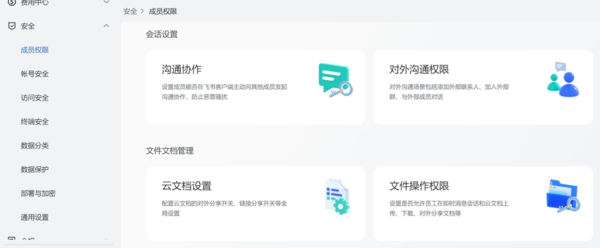 1,具体该如何在飞书上进行相应操作才能保证企业文件信息安全呢,我们在管理后台按照下图的指引,点击“安全”选项,进入“成员权限”这个页面,再选择“文件操作”权限。