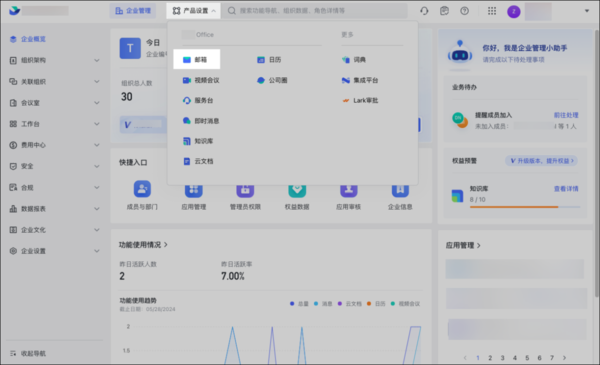 1,第一步,我们在飞书客户端进入管理后台,找到“产品设置功能,点击“邮箱”。