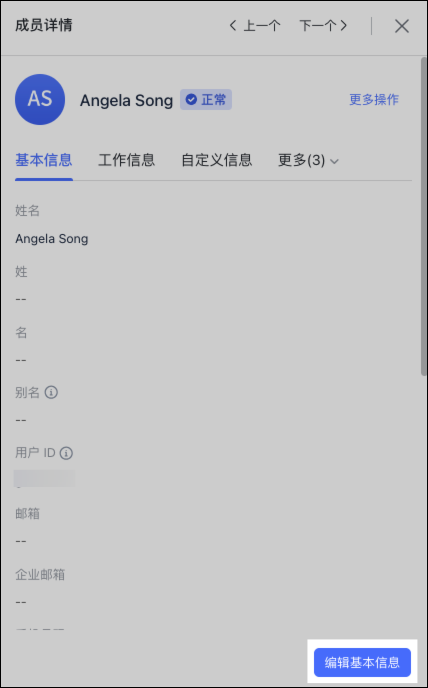 6,如果是给老员工分配或者修改企业邮箱地址,就在成员操作列表下方点击“详情”,然后在这个成员详细页面再选择“编辑基本信息”,把企业邮箱的地址输入进去,不要忘记点击保存。