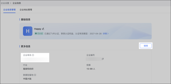 2,企业的管理员可以选择和自己企业名称或者品牌相关的信息作为域名地址,比如feishu.com,我们在这个页面中点击“编辑”功能,然后找到“企业域名”这一项,输入新的域名后保存。