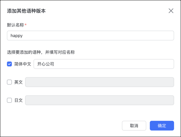 3,选择“多语言”,然后勾选需要添加的语种,并填写其他语种版本的企业名称,然后点击“确认”,在管理后台切换语言时,企业的名称就会改变为对应的语种名称了。