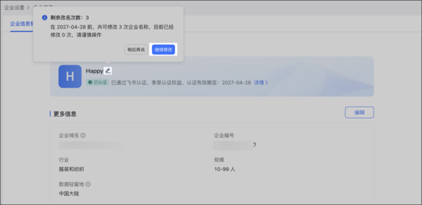 1,如果你的公司在飞书上是认证企业,可以在企业头像右边点击一下就会显示出你公司剩余的改名次数机会,然后点击继续修改,就可以对企业名称进行修改了。