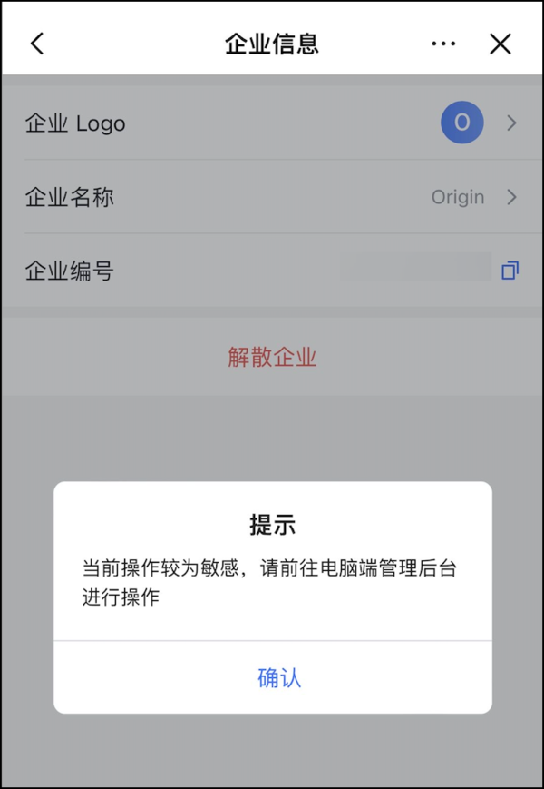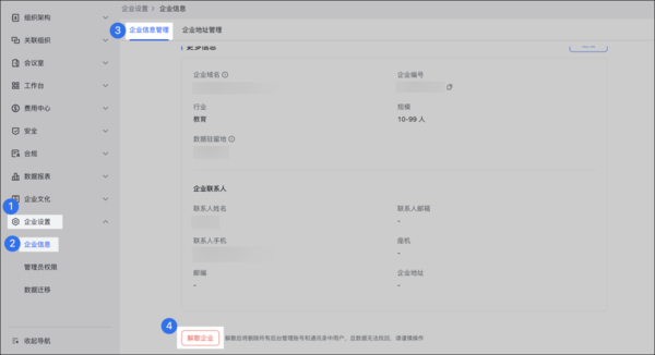 1,如果要注销,只有企业创建人可以在飞入后台进行操作的,而且解散企业之后系统将删除管理者的后台账号以及通讯录上的成员,并且数据无法再恢复,所以如果要执行这一操作一定要谨慎想清楚。