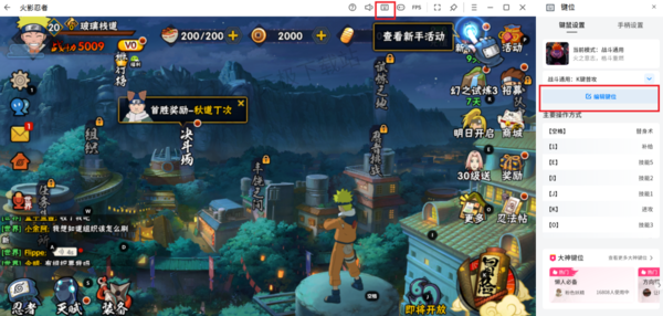 1.在腾讯应用宝打开火影忍者手游,点击上方【键盘】图标,在右边的弹窗上方有【键鼠设置/手柄设置】,下方有【大神键位】可以直接使用。也可以自定义设置,选择【编辑键位】。