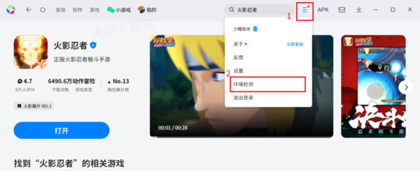 小编实际体验发现,在电脑上玩火影忍者手游对电脑的配置要求并不高,毕竟只是作为手机模拟器来使用,只要手机能运行,在电脑上配置要求就会低一些,一般来说只要处理器达到I3,内存4G就可以顺利游玩。我们也可以通过腾讯应用宝的【环境监测】功能来判断电脑配置高低,方法如下。