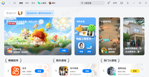 《火影忍者》是风靡全球的动漫作品,其IP衍生出的周边游戏非常多,比如火影忍者手游,这款游戏在手机端玩家很多,非常火,但是并没有推出电脑端,很多喜欢在电脑上玩游戏的火影迷对此很是惋惜,正好最近小编发现腾讯应用宝可以在电脑端下载各种手游,其中就包括了火影忍者手游,下面小编就为大家详细介绍一下。
