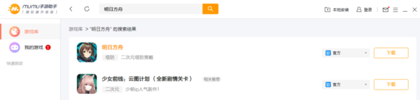 步骤一:已经下载安装好MuMu手游助手的小伙伴,可以直接打开软件并登录自己的账号。在软件上方搜索框中,输入明日方舟进行搜索,找到对应游戏之后,点击右侧的下载。