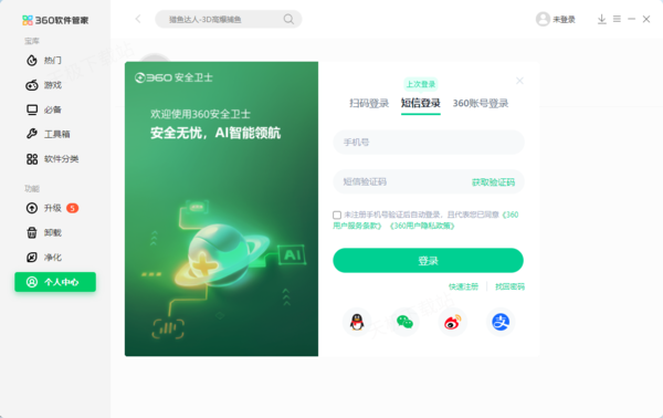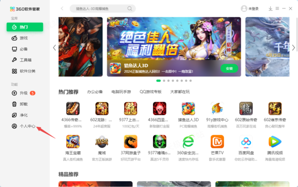 1、启动电脑端的360软件管家,点击左侧列表中的【个人中心】选项。