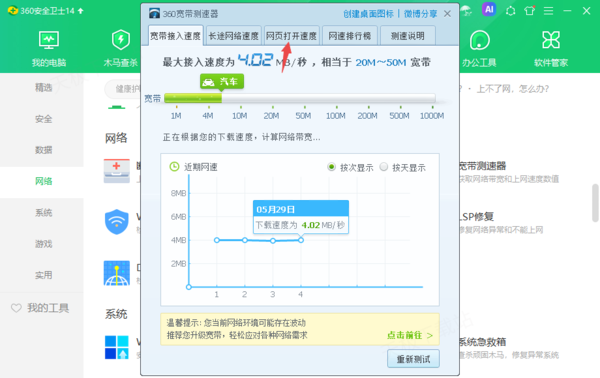 3、网速测试完成后,点击测试结果上方的【网页打开速度】选项。