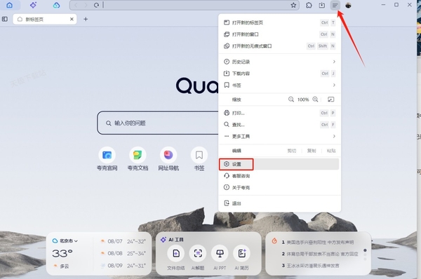 首先,打开夸克浏览器电脑版,点击页面右上角的控制按钮,选择“设置”选项进入浏览器的设置界面。