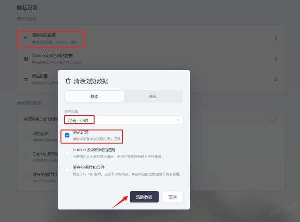 在隐私设置页面中,找到“清除浏览数据”选项并点击。接下来,您会看到一个选择框,其中列出了多种可以清除的数据类型,如浏览器记录、缓存图片和文件、Cookies等。为了彻底清除浏览记录,请确保勾选上“浏览器记录”选项,并根据需要选择时间范围(如过去一小时、一天、一周或全部时间)。最后,点击“清除数据”按钮即可完成操作。