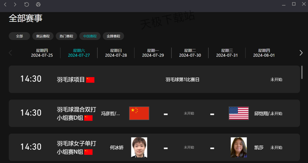 在【奥运会】专栏界面,点击右侧【全部赛程】,可以看到近期全部赛事,上方还可对中国赛程、金牌赛程进行筛选。