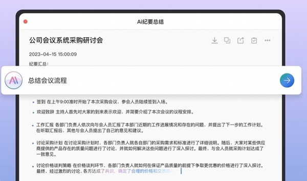 这款会议软件中拥有多种智能化AI应用,其中就包括自动生成会议纪要,随着会议的进行,AI会不断记录、整理、提炼内容,从而不断形成会议纪要,这样在会议的过程中,我们就能快速了解当前阶段的会议总结,非常强悍。