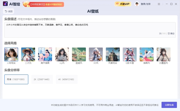 这是一款名副其实的软件,因为用起来很简单,让我们感觉很清爽,就连AI壁纸功能也不例外。在此我们可以通过简单的文字描述操作去描述出AI壁纸中的成分,对于风格,软件也会根据我们的描述进行智能推荐,比如山水就会写实,可爱的人物就会偏二次元一些,如此智能化设计还是让人为之震惊的。