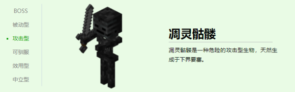 在我的世界中,凋灵骷髅是一种危险的攻击型生物,同时也属于亡灵生物,天然生成于下界要塞之中。凋灵骷髅在外形上与骷髅相似,但却比骷髅更加危险,会拿着石剑进行攻击,被击中的玩家会有10秒的凋灵效果,持续性的减少角色生命值。