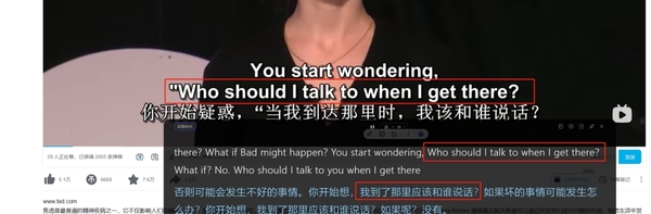 倘若你想体验一波能同步的视频翻译,那用百度AI同传助手准没错,当我们开启软件,再播放视频,就可以看到百度AI同传助手一边识别视频中对话、旁白内容,一边生成译文,功能很强劲,而且它是支持中英互译的,无论你是看英文“生肉”(没字幕视频),还是说想通过一些普通视频去学英文,都是没问题的。