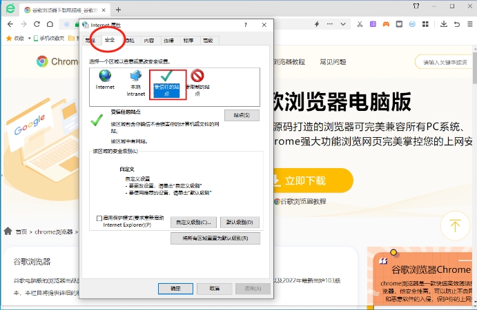 2、在“Internet选项”窗口中,选择“安全”选项卡。然后,在“选择一个区域以查看或更改安全设置”部分,点击“受信任的站点”图标。